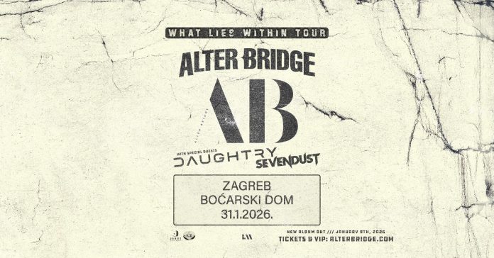 Američki rock titani Alter Bridge vraćaju se u Zagreb, a velika turneja “What Lies Within” dovodi ih u Boćaski dom u subotu 31. siječnja 2026. Posebni gosti na koncertu biti će američke rock grupe Daughtry i Sevendust.