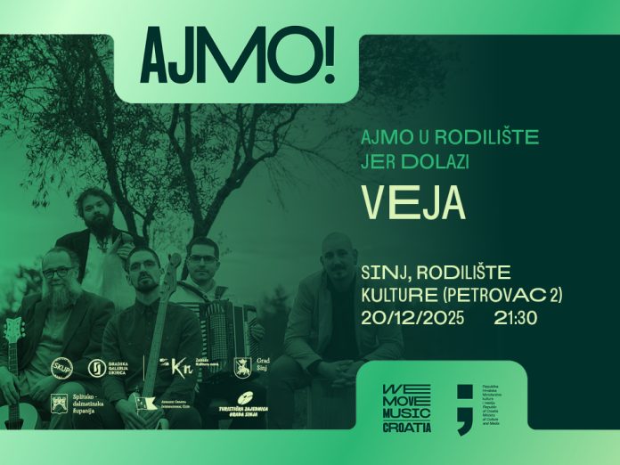 Jedan od najznačajnijih hrvatskih world music bendova – Veja, 20. prosinca 2025. nastupit će u sinjskom Rodilištu kulture (Sinj, Petrovac 2). Grupa Veja osnovana je 2007. u Pazinu, a tijekom svojih 15 godina rada postala je jedna od najznačajnijih hrvatskih etno/world music izvođača. Od početka svojeg rada Veja je inspiraciju pronašla u specifičnoj istarskoj tradicijskoj glazbi koju je odlučila izvoditi na moderan način.